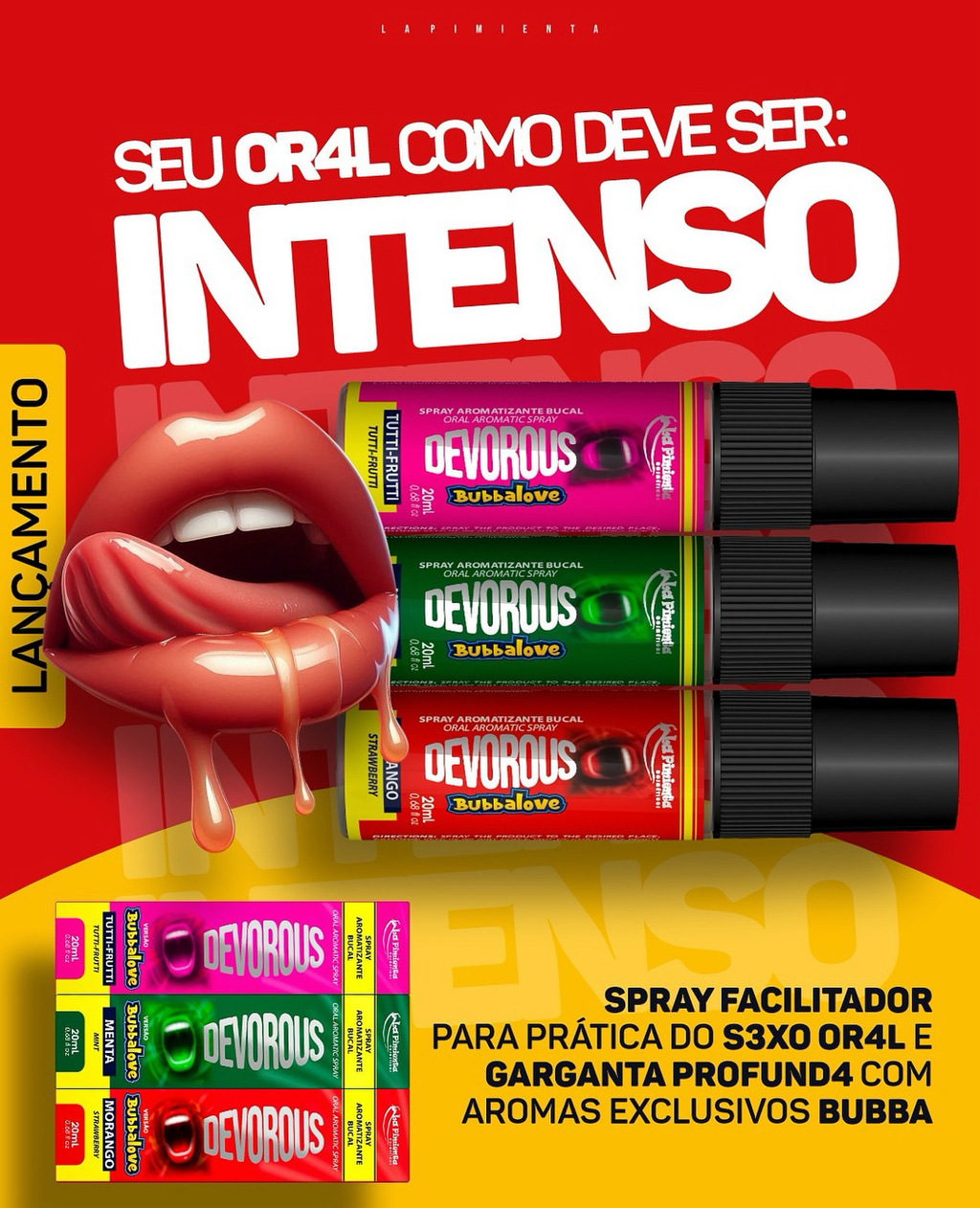 O Devorous Bubbalove da La Pimienta é um spray funcional facilitador desenvolvido especialmente para elevar a experiência do sexo oral. Com aroma envolvente de morango chiclete e fórmula potente, ele suaviza possíveis desconfortos, facilita o deslizamento e intensifica os estímulos, proporcionando mais prazer e conforto para quem faz e quem recebe. Ideal para explorar sensações com mais liberdade e desejo.